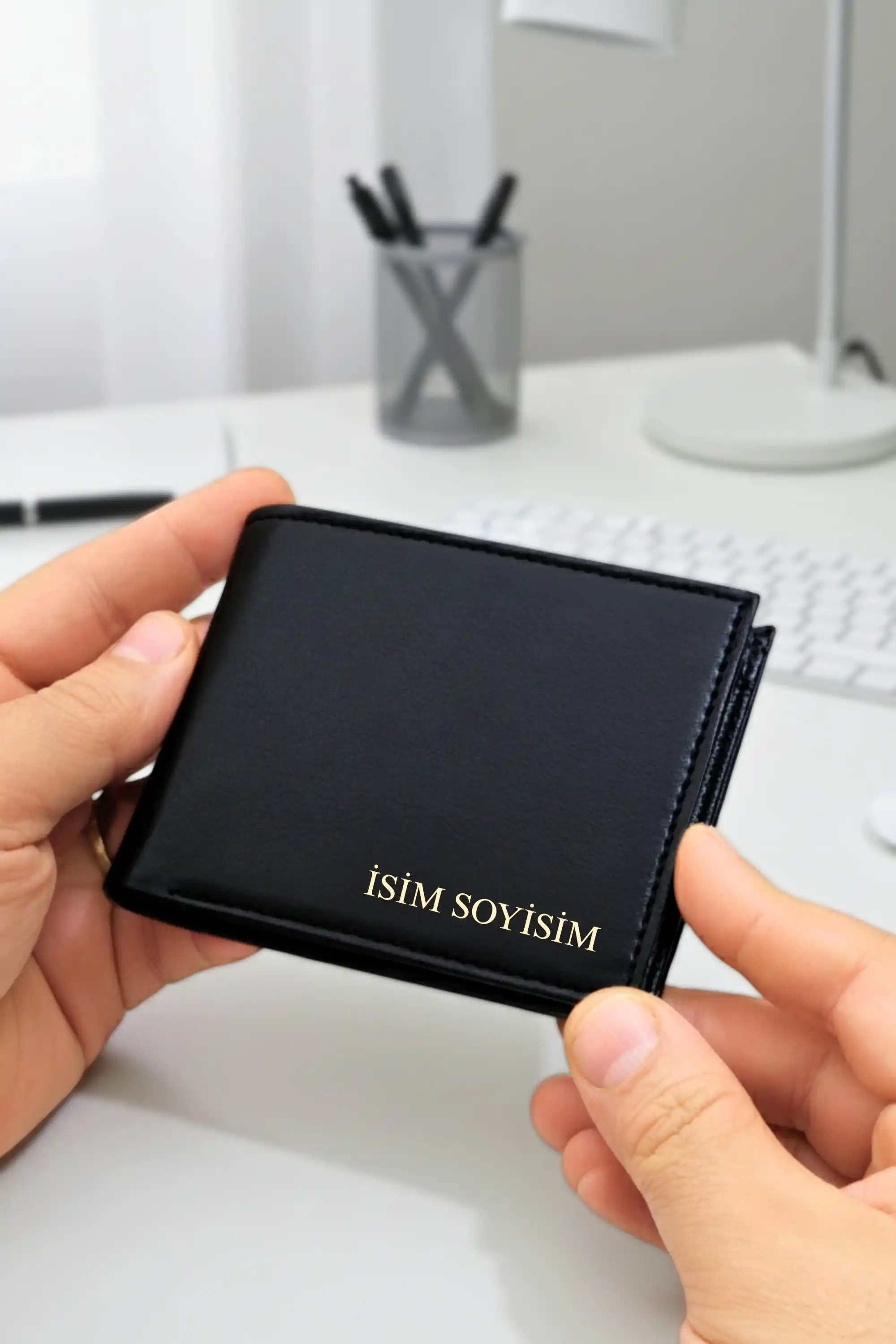 Vegan Deri Cüzdan İsim Baskılı Süper Ince Model 5 Adet Kart Kapasiteli Gizli Çıtçıtlı Kapama Siyah